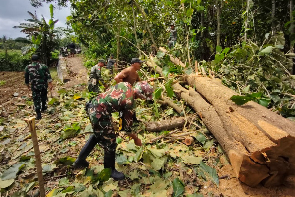 Sejak pagi, Babinsa bersama warga di lapangan menyiapkan area pembangunan dengan melakukan pembersihan lahan, penebangan pohon di sekitar lokasi, hingga merapikan ranting yang menghambat akses kerja. Kegiatan ini menjadi tahapan awal pembangunan jembatan gantung yang dinantikan masyarakat setempat.