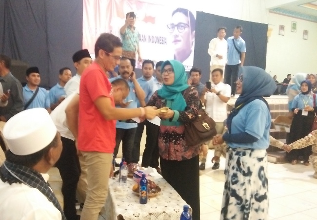Ada juga emak-emak yang memberikan dukungan materi yang diserahkan langsung kepada Cawapres RI, Sandiaga Salahuddin Uno. (Fik/Nit)