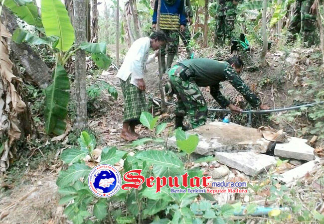 Seputarmadura.com, Sumenep, Kamis 9 Nopember 2017- Sikap menggalakkan gotong royong ditunjukkan Babinsa Koramil 0827/15 Batu Putih, Kodim Sumenep, Madura, Jawa Timur, dengan membantu warga membenahi pipa saluran air yang rusak, di Desa Juruan Laok.