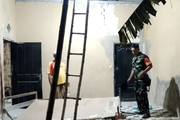 “Akibat hujan dan angin kencang, tembok rumah sebelah kiri roboh ke arah luar,” jelas Sertu Sunaryo saat di lokasi kejadian.