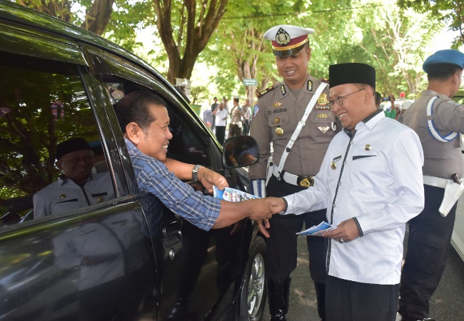 Nampak Kapolres Sumenep, AKBP Joseph Ananta Pinora, dan Bupati A. Busyro Karim beserta forum koordinasi pimpinan daerah (forkopimda) lainnya, turut membagi-bagikan brosur tertib berlalu lintas di depan Mapolres setempat.