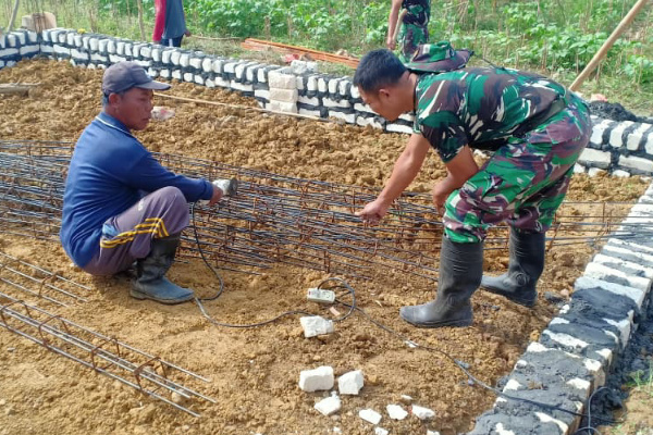 Anggota Satgas TMMD bersama warga bergotong royong memotong, menyusun dan mengikat besi tulangan sesuai ukuran konstruksi. Rangka besi tersebut dipersiapkan sebagai struktur utama pilar sebelum dilakukan pengecoran beton, guna memastikan bangunan kokoh dan tahan lama.